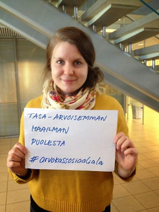 Ständillä käyville sosiaalityön opiskelijoille olimme varanneet mahdollisuuden otattaa itsestään kuvan, jossa he poseeraavat #arvokassosiaaliala-hashtagilla ja jollain sosiaalityön arvokkuutta perustelevalla lauseella varustetun lapun kanssa. Nämä kuvat julkaistiin TaSO ry:n Facebook-sivuilla.